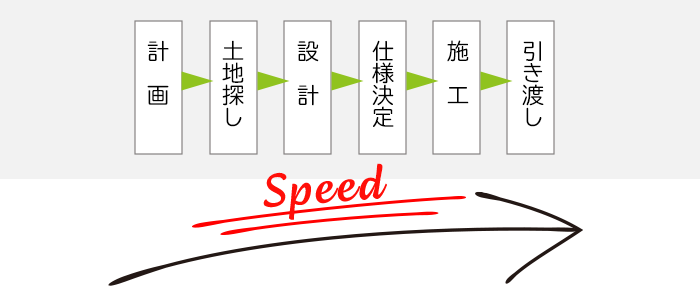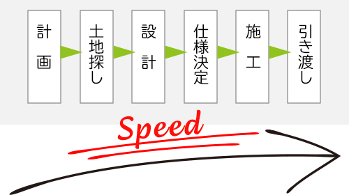 計画、土地探しから施工までのすべての流れを対応します。 規格化されたシステム工法を用いることで、 在来工法よりも安く早く建てることが可能。